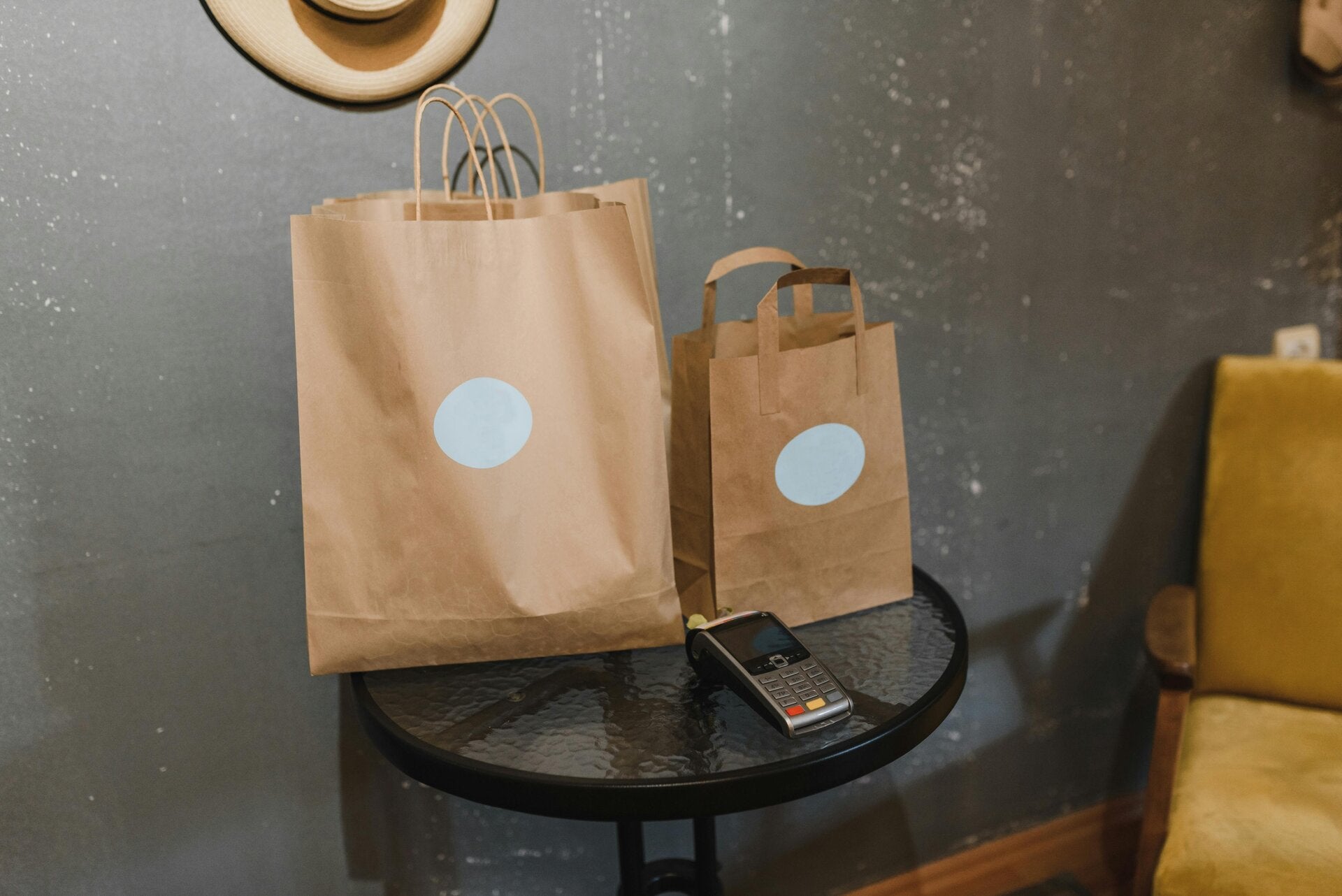 Bolsas de papel kraft o blancas con tu diseño. Ideales para tiendas, eventos y promociones.